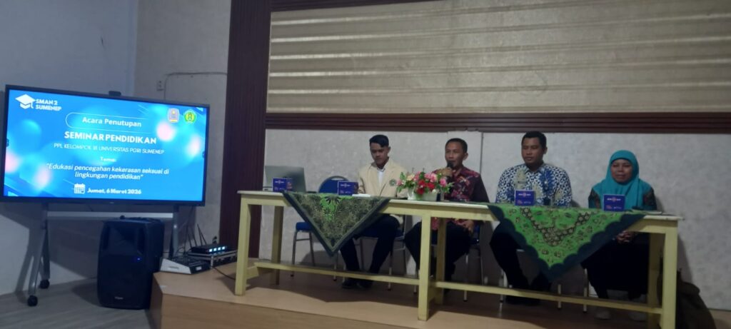 Penutupan PPL Universitas PGRI Sumenep diakhiri dengan kegiatan Seminar Pendidikan dengan tema “Educasi Pencegahan Kekerasan Seksual di Lingkungan Pendidikan” oleh Roudlatun, M.Pd.I. Kegiatan seminar ini dihadiri perwakilan pengurus OSIS SMAN 2 Sumenep dan beberapa perwakilan kelas. (TONDO GROUP)